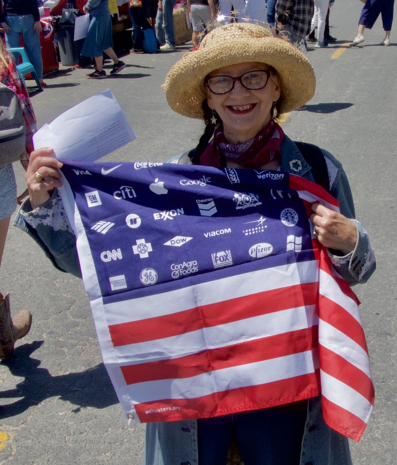 The wildness and the love for each other still shows up. There was a thrilling contingent from Mendocino Coast Safe Space, dancing under pride flags. There were old hippies under peace flags. Those were great. But there were also upside-down American flags, thin blue line flags and thin red line flags. Like the ridiculous message on the red hats whose wearers try to convince us that America was made great by whiteness and cruel wealthy hoarders, those who mess with the flag are missing that America the WE needs its symbols and myths.