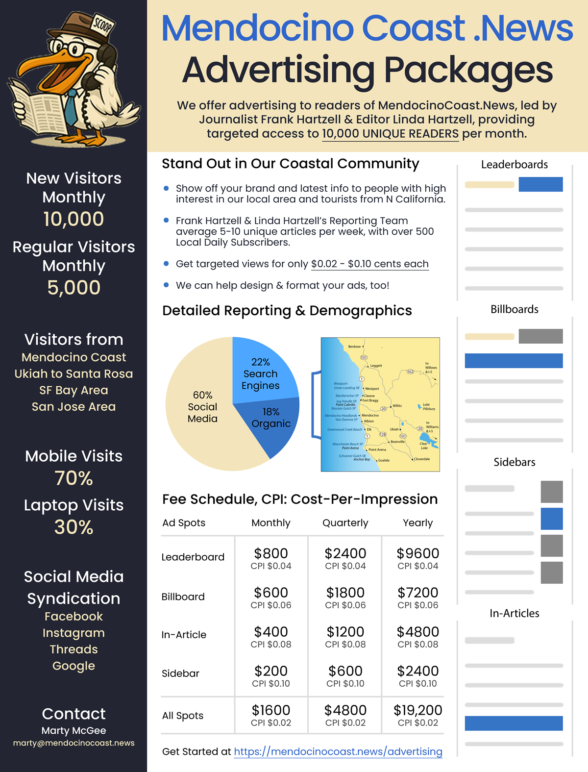 We offer advertising to readers of MendocinoCoast.News, led by Journalist Frank Hartzell & Editor Linda Hartzell, providing targeted access to 10,000 UNIQUE READERS per month.