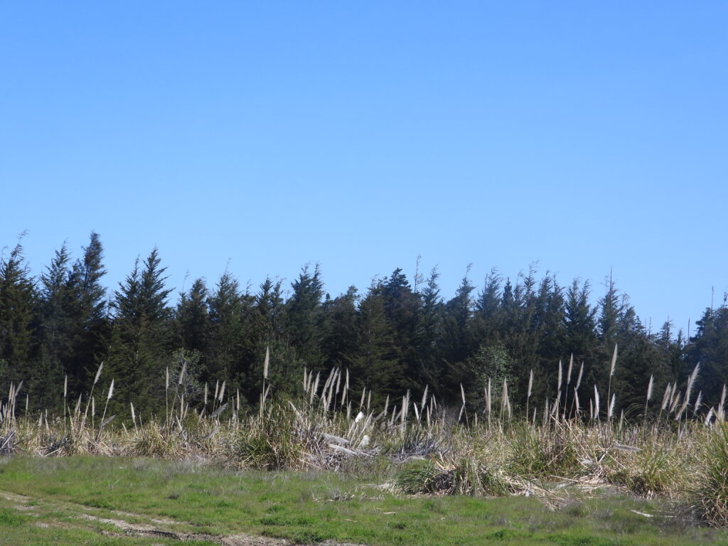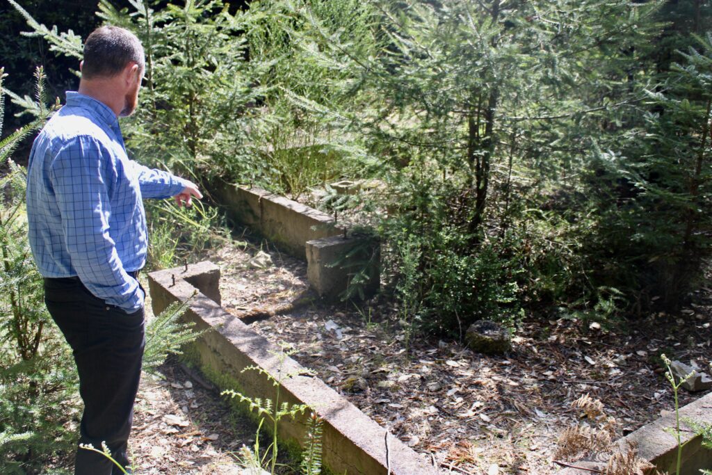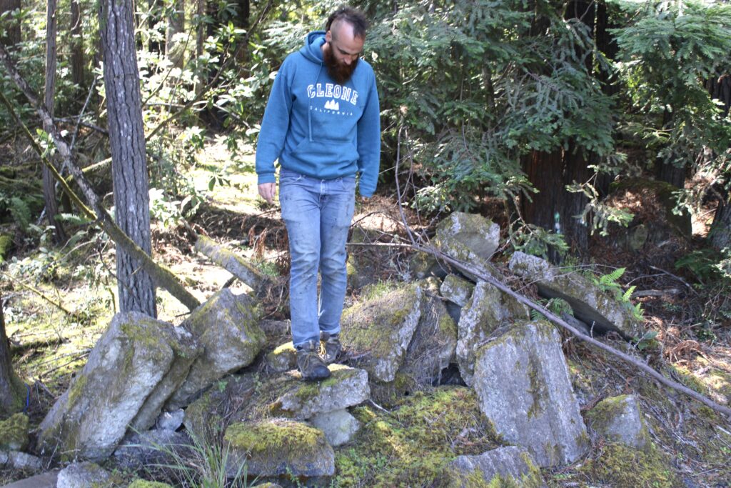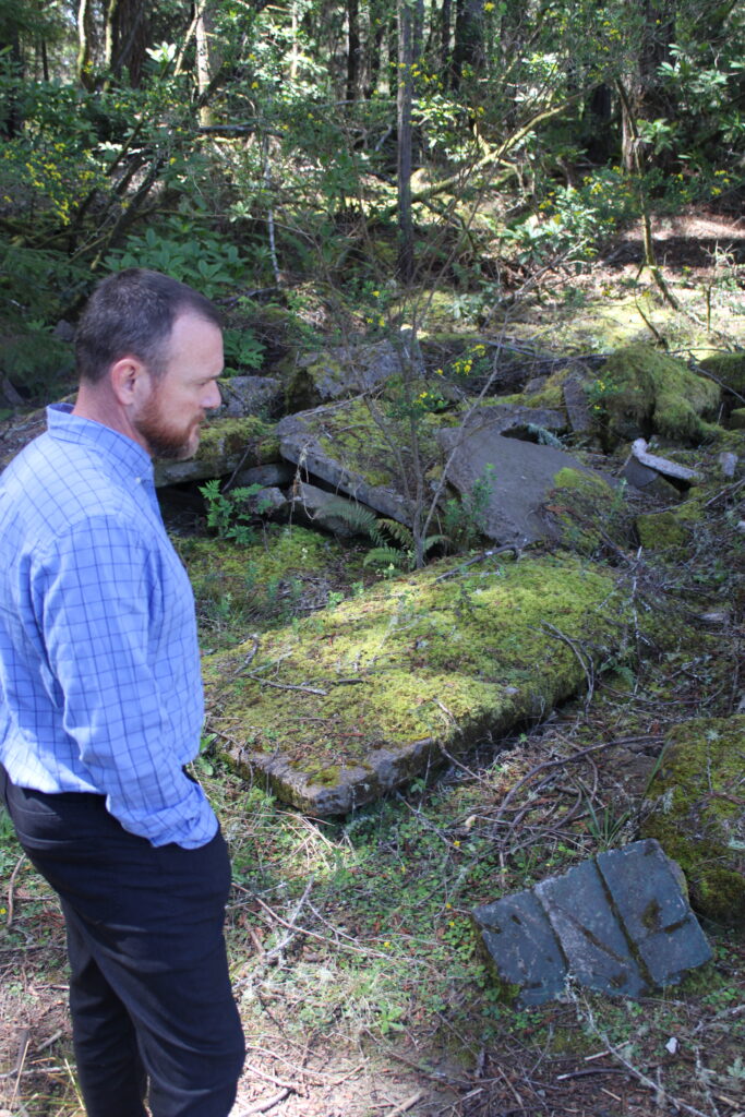 But it will also make an awful mess if we don’t have a vigorous group of local residents to provide eyes on the area and track down the jerks and sue them if need be. (We could do that right now if some of you wished to help.). Below, we provide some shots of the area, including an old building and on the right, city public works head John Smith next to some of the many concrete blocks from the old Noyo Bridge and other places that were used decades ago to keep the creeps making a huge mess out. Things were badly out of control. The area is now used for dog walking on a daily basis by the Mendocino Coast Humane Society, so this is not the part of the 500+ acres where the track should go, there is plenty more land away from here.