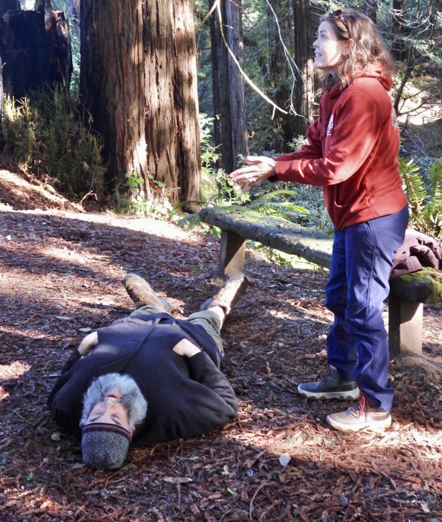 Fortunately, all of this was staged as part of Laurie Starr’s First Aid/CPR Wilderness Training class through her company StarrCPR, she is offering to companies and others who work in the forest. The setting was truly an epic redwood forest of the kind Paul Bunyan might be found in. But it was the city of Fort Bragg’s Otis Johnson Wilderness Park in the middle of Fort Bragg.