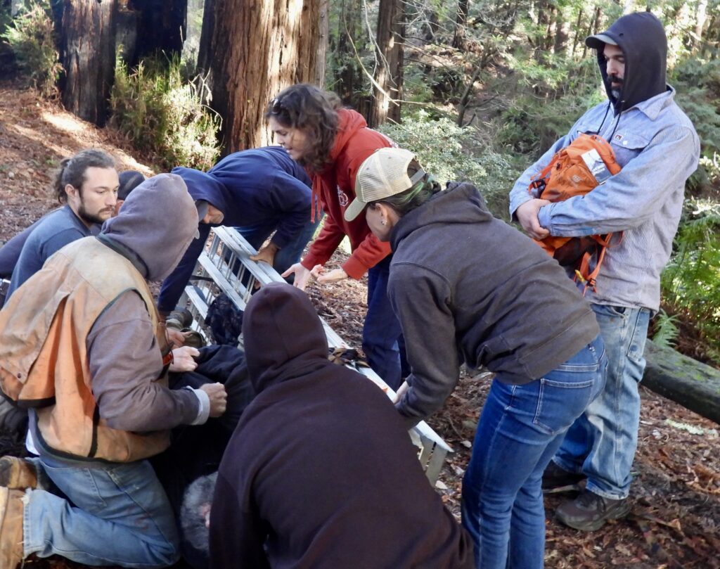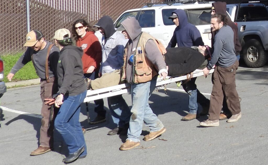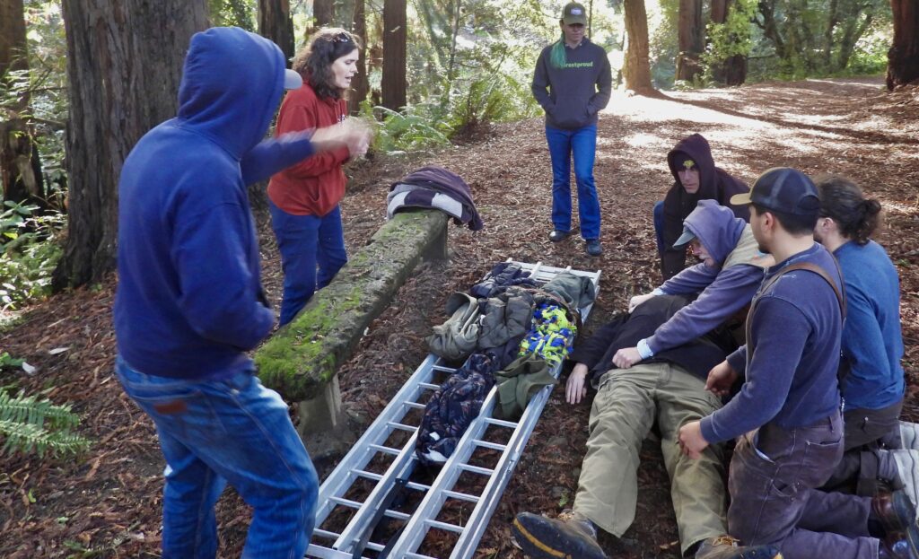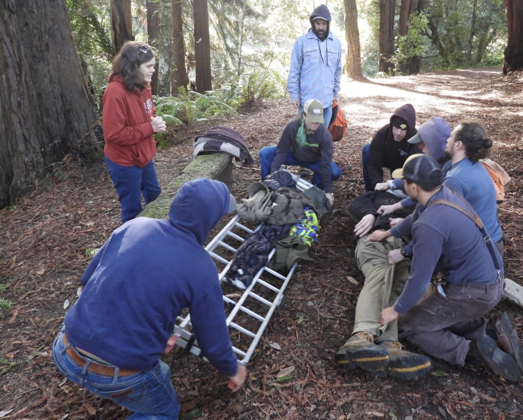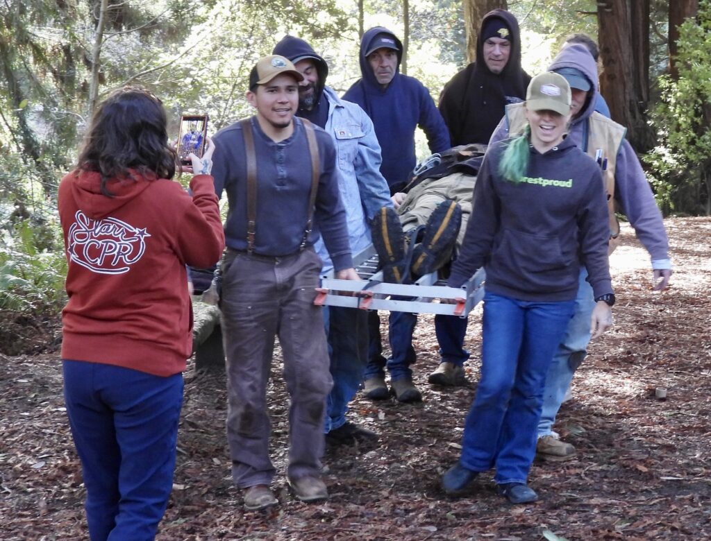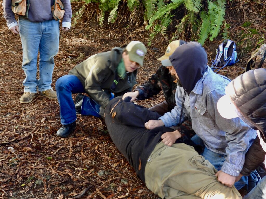 Employees of the Redwood Forest Foundation/Usal Lumber Company took turns being “injured” while the rest of the 9 people on hand learned from Starr what to do when someone breaks their leg, or hits their head and a plethora of other injuries that can be much more life-threatening when suffered in our remote forests and beaches.