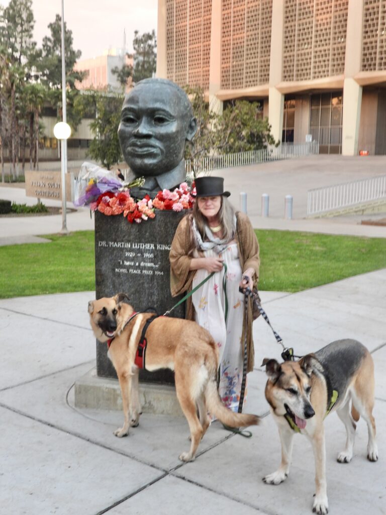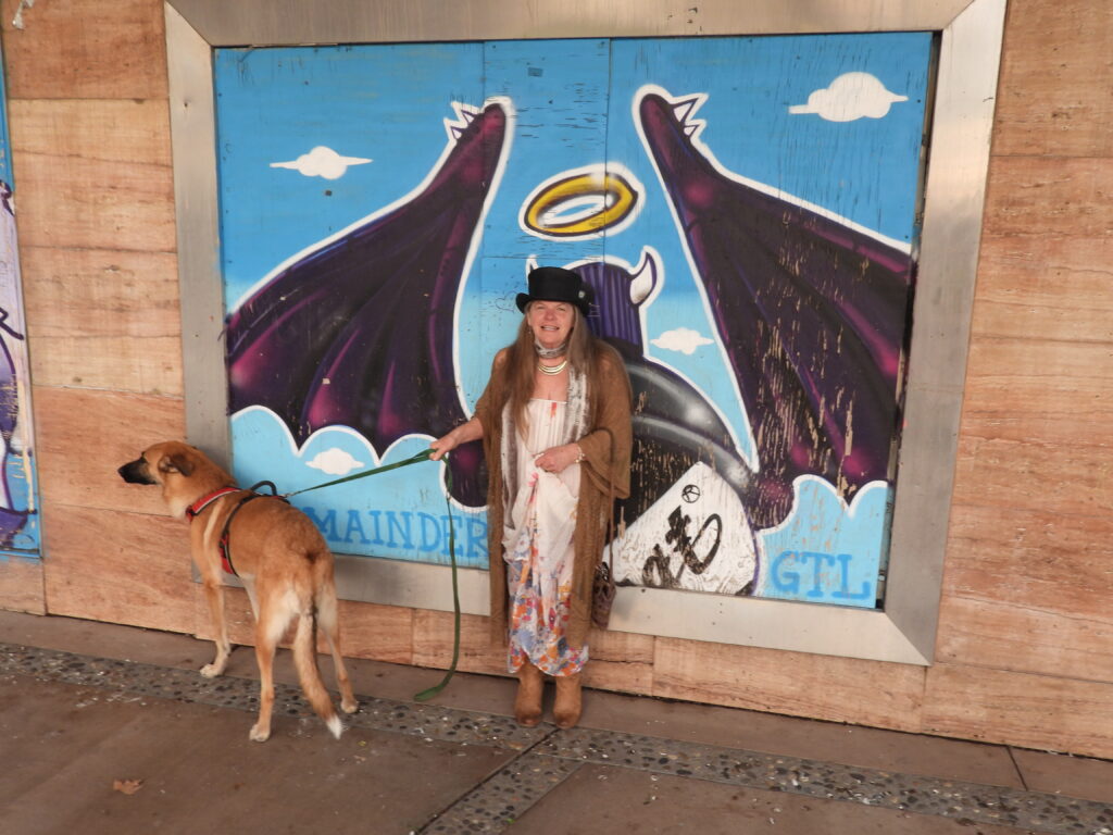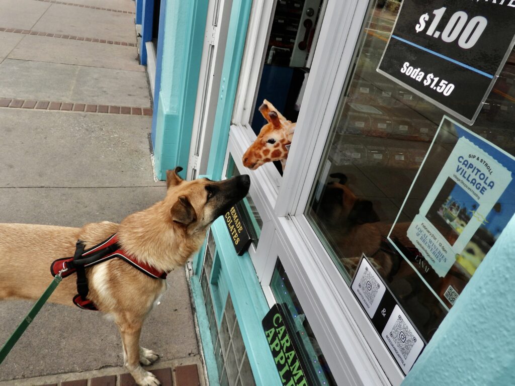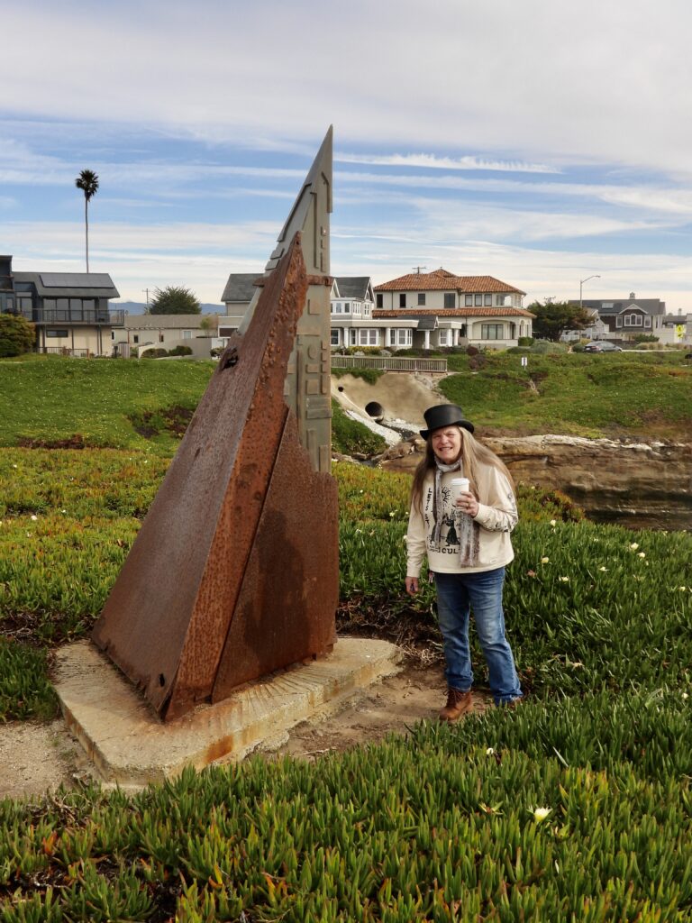 You know they see as much — maybe more — than we do. Dogs read the world in layers we’ve forgotten how to notice: scent‑stories carried on the breeze, emotional weather patterns shifting between strangers, the quiet truth of who’s safe and who’s hurting. Their noses are just the doorway; it’s their togetherness that does the real seeing. They move through the world assuming connection, not suspicion. They trust first, observe deeply, and forgive faster than we can process. They remember what we’ve unlearned — that community is sensed, not argued; that presence is a language; that love is a kind of navigation.When the Dublin dog park opened, they decorated the fence with silhouettes of the regulars — the dogs who made the place what it was. Most of those old friends have crossed the rainbow bridge now, but their shadows still keep watch.Jimmy Buffett knew: The journey of life is sweeter when traveled with a dog. He wasn’t being cute — he was pointing to the creatures who greet the world with unfiltered presence, who don’t hoard grudges, who find delight in the ordinary. Dogs remind us of the part of ourselves that hasn’t been numbed by hurry or fear. They carry the lesson in their bodies: joy is not a luxury, it’s a way of perceiving.People really are made more “joyous” by the psychic joy of dogs. They broadcast it without trying — a kind of emotional Wi‑Fi that lifts the whole room. Dogs don’t just feel joy; they radiate it, and we tune into that frequency whether we mean to or not. Their happiness is contagious in the oldest, most biological sense: a reminder that connection is instinct, not theory. When a dog is joyful, the world around them brightens, and we remember, briefly, how to be human again.Of course, we see this sort of thing at home every day — just with the dogs, not the sea lions. And honestly, the dogs do it better. They patrol the neighborhood like furry monks, studying the breeze, decoding invisible gossip, and reminding us that half of life is paying attention. They don’t just notice the world; they mentor us in how to belong to it. Sea lions bark, but dogs? Dogs deliver sermons in sniffs.Somehow when you see something on vacation, it’s just cooler. The same thing at home barely earns a glance, but on the road it suddenly feels cinematic. .Travel doesn’t change the thing you’re looking at; it changes the part of you that’s doing the looking.Sure, she looks like an angel… but don’t let the wings fool you. Halo optional, mischief guaranteed.I sure had a cute date for the trip — artist Alan Burris’ 1986 pyramid, revived from salt‑death more than once and still looking good enough to take out on the town.Linda scored a happiness‑making bathing suit in Capitola… only to discover the new Hyatt in Fresno doesn’t even have a hot tub. Timing is everything.MLK, a personal hero of Linda’s, is among the DEI figures some political voices have tried to sideline, minimize, even remove in our national story. But his legacy isn’t something that can be erased. His vision of unity isn’t just a dream to admire from afar — it’s a blueprint we can choose to live out, build, and make real.Linda made it 64 years without ever touching snails — escargot, if we’re being fancy — but she tried one for me. She said the fears were gone… but thanks, NO — she didn’t want another one.She’s no escargot aficionado — but on a road trip she’s pure charm. Sexy, adventurous, and willing to try.Linda let her hair down from our motel room so we could climb up — a roadside Rapunzel moment, minus the castle but with way better lighting.If you roadtrip with Linda, she’s the driver. Some guys I knew in Texas thought it was unmanly to let a woman drive — I think it’s perfect for napping and picture‑taking.The thing I love about journalism — and hate about AI — is that when you go looking for facts, it’s never what the encyclopedic databases think it is. Back in the ’80s, more and more crows started pouring into Yuba City, thousands of them lining wires and trees above people just trying to sleep. Everyone assumed something terrible was happening in the environment. The studies finally came in, and the big revelation? Nothing was wrong. The crows had simply decided it was cool to party in town. They’re flock creatures, after all — unlike their close cousins we have here, the ravens, who prefer a quieter life. The crows literally talk to each other and tell each other stories about great hangouts-on telephone poles.There are miles and miles of hoop houses with no plastic between Santa Cruz and Bakersfield. I couldn’t tell if they were abandoned pot farms or something else entirely — but most of them seem to be raising some kind of berries now. California agriculture never stops reinventing itself, even when it looks half‑finished from the highway.Black sheep arise and lead us back to sanity!You won’t find Jakl on ChatGPT or Google Search — but every tagger knows the name. A ghost, a rumor, a signature in motion. Lead us, Jakl.Almost every freight car was tagged. The railroad must allow this, right? It actually seems like it would benefit them — the cars are more visible, more colorful, and it’s hard to imagine it does any harm, unlike tagging on private buildings. And somehow, out of a hundred tankers and boxcars, I didn’t see a single gang tag. There must be some unwritten code or quiet filtering going on, because the art is everywhere, but the threatening stuff is nowhere.The ancient brick walls along East Oakland have stood there since the 1950s, when the Nimitz Freeway sliced the city in half. In the early 1900s, these were working cotton mills, back when the neighborhood was called Jingletown. They look terrifying now — leaning, cracked, ready to crumble — but engineers have studied them. They even stayed upright in 1989 when the Nimitz itself collapsed just blocks away. And s