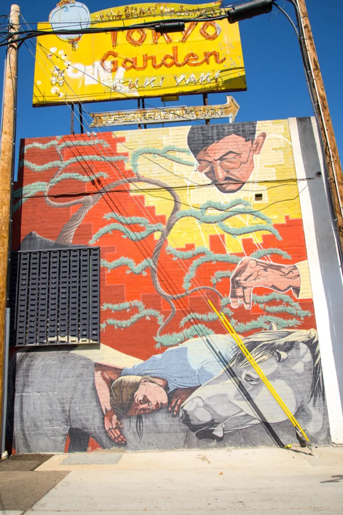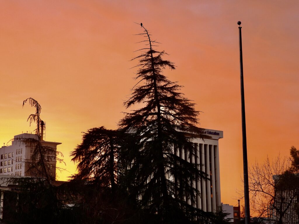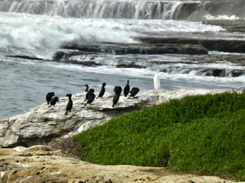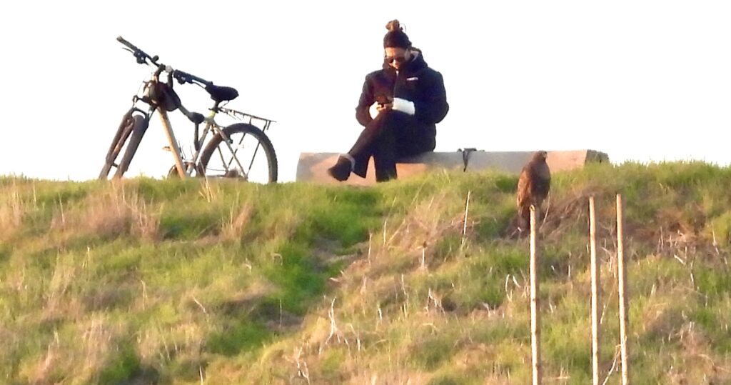 Palm trees are that quintessential California phenomenon from Hollywood, take incredible beauty and dress it up. Lets cut back on the unreal stuff folks!Fresno was an early mural city but everyone is doing it now, we have great ones in Fort Bragg too.Tioga-Sequoia Brewing Co restored a 19th century facility to make its tasty brews and had a mural of the old steel Fresno sign that hung over the street (and I think is still there) . North Coast Brewing’s Mural is better and the beer has a much wider range.The old Tokyo Gardens was very early DEIThe youngsters look into the future through an ancient Fresno business, the Japanese restaurant, whose owners brought DEI to Fresno after WWII.Courthouses were once revered as the center of American Democracy. I dont trust the California courts, nor revere them since they gave up any attempt to be open and available to the public or the press. It’s a secret club now where nobody can challenge a DA with facts. The officers of the court have walked away from their legal obligation to have an open, public and trusted court system. I won’t do jury duty ever again. It’s not a public court system and one now doomed to corruption without light able to come in.High above the courthouse in the tippy top of the tree is a red-shouldered hawk who watched everything for an hour while we had fun with each other and the dogs.On the highest tree above Courthouse square, this redhouldered hawk watched for a half hour while we were there and the sun set.We watched a jury come out at the end of the day and mix with the crowd, enjoying the sunset. The jurors were the most diverse group of people ever. This is their county too. We don’t give the non-whites the same feeling in Ukiah.This courthouse was hated for its modern design when it was built in 1966, replacing a neo-classical courthouse from 1875. Now, Fresno plans to replace this one to the tune of $800 million. The California Judicial Council is the worst public agency in all California, wasteful, unelected and uninterested in any public access of any kind. YOu can be sure any new courthouse they approve will have zero opportunity for the public or press to review files.Capitola’s Venetian Village dates from 1924. These true beachfront colorful shacks now stage a typical battle, with the Air B and Bs having taken over much of this housing, home to workers and retirees for most of the century. A few are run down. A little elderly lady sat in her living room watching us tourists go by from her little living room. She didn’t speak until she saw Caesar, who talked back to her. I didnt butt in.This egret was like 1/3 the size of the egrets that come to our pond in Fort Bragg. Egrets seem much smarter than herons. One here on our pond made friends with our ducks and would put his head down to their level and they would waddle about talking to him for a couple years. Then he didnt come for a long time and when a white egret appeared again, they charged in joy. This scared the egret and he flew away in terror, not being their friend, just a Great White Egret.The Capitola egret came up on the pier even though there were lots of people and dogs around and took a nap.Birds spend a lot of time thinking and adaptingThis egret looked at the dogs and I for about two hours in Capitola. He was the only egret among hundreds of ravens or crows and gulls. He watched them all and seemed to be just enjoying his day. He grabbed a tiny white critter here and ate it, but napped and voyeured other than that.I was eager to photograph a sea otter and saw a dot way out on the ocean in Santa Cruz. He’s taking a nap!We talked to a few locals in Capitola. The pigeons were a sore point.Another egret, much taller joins the comorants along scenic W. Cliff DriveThe team was rapt while the coach gestured after practice. MIght be some sort of Olympic squad? Or maybe the UC Santa Cruz teamHis sunglasses were his way of being subtle. I took this photo and later watched all ten of the gals from the sunrise workout flip‑flop back to their apartment, laughing, glowing, loving life. They even posed for a picture, and I was the one who ended up embarrassed — they just laughed, petted the dogs, and kept moving. By then everyone was in shorts, the morning fog burned off, and face‑to‑face felt so much more real than anything online. I was one of a dozen tourists shooting the beach scene, but I had the two big dogs and the giant camera — just happy, healthy people in perfect shape, loving their sport, loving the morning, loving being alive. When you meet people face to face its very difficult to ignore their humanity. Online living dehumanizes more than watching through a camera. Too many clothes are ways of hiding. We are all beautiful and real!