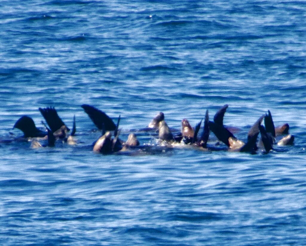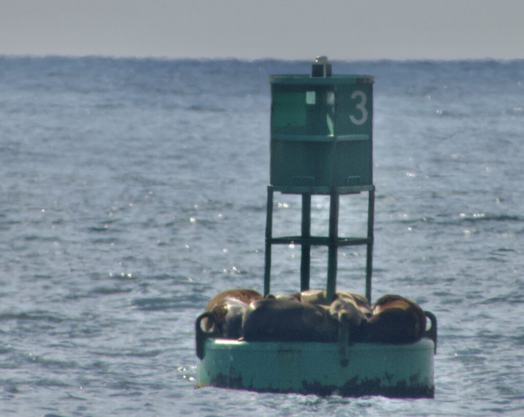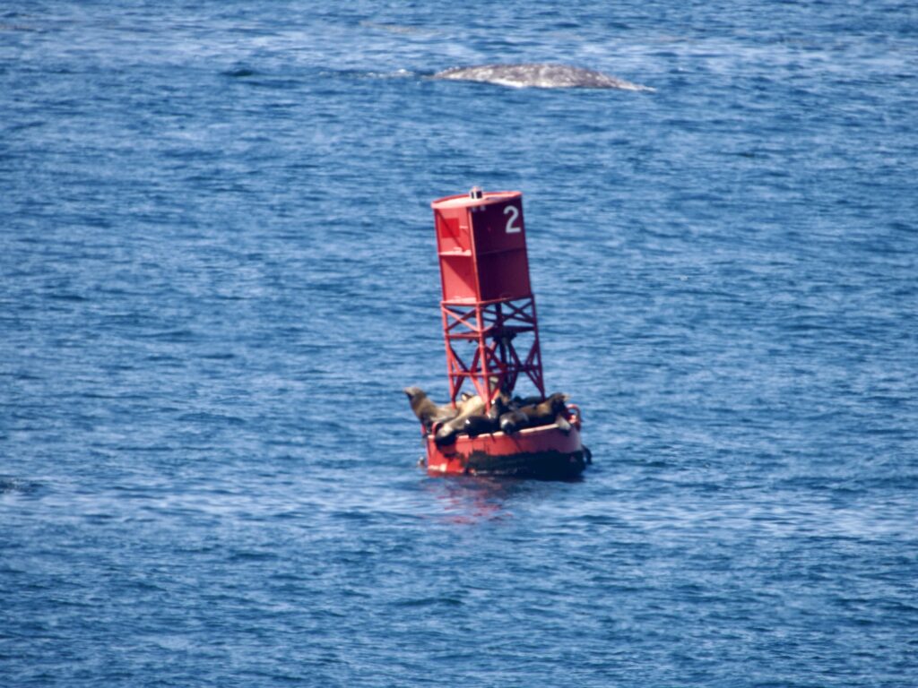 The seals and sea lions had to evacuate the green bouy and watched from the red one. You can see the whale surfacing just above the buoy, while the sea lions seem to be looking at the ship.