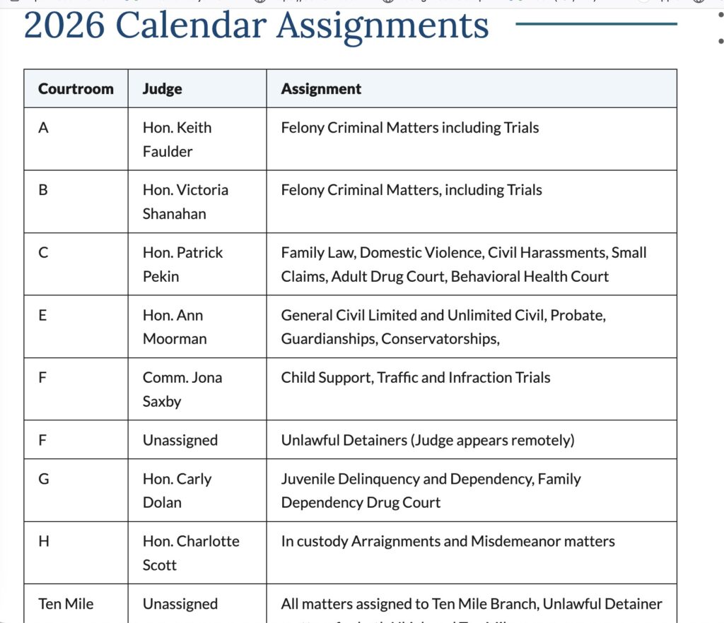 Pekin was elected in 2020, running unopposed for the seat vacated by retiring Judge John A. Behnke. At that time, Brennan was the assigned Fort Bragg courthouse judge, and Pekin served in Ukiah alongside the rest of the bench. Pekin began covering Coast calendars even before Brennan suddenly retired without public explanation in October 2025. By then, the court administration had already been moving jury trials and civil matters inland, later citing Brennan’s retirement as justification for further consolidation.