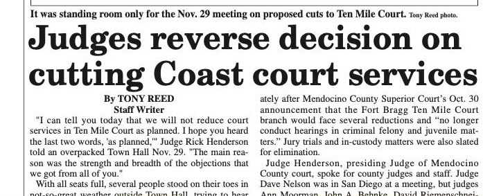 This seems like a sneakier repeat of 2012, when the judges in Ukiah faces a gigantic uproar when they announced similar cuts, which the community figured out was eventually going to result in the closure of the 10 mile Courthouse entirely.  The new courthouse planned for Ukiah has enough courthrooms for all the judges.