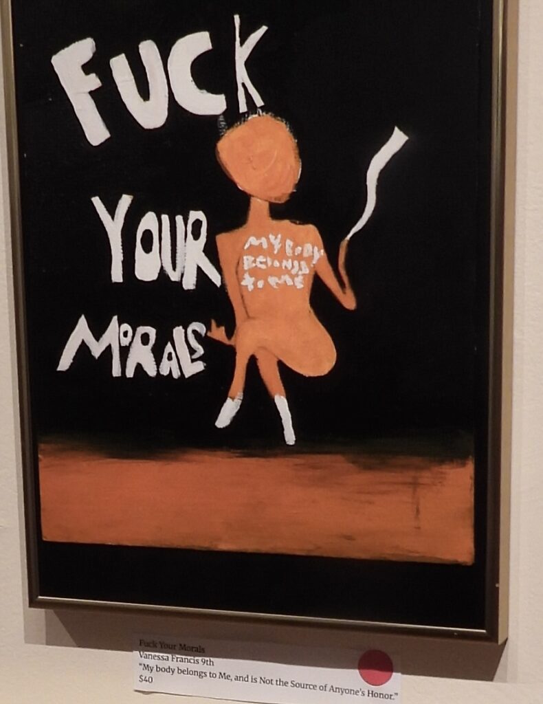 This is experimental art from high school students at its best — raw, fearless, and, frankly, some of it is astonishingly good. These teens are coming of age in a moment that feels chaotic, dishonest, and often cruel, and their work doesn’t look away from any of it. Instead of staring up at the noise and confusion of the wider world, the show invites viewers to look closer: at the art, at their classmates, at their families, at the teachers who steady them. Many pieces take direct aim at the violence women endure and the unstable, truth‑bending world this generation is inheriting.