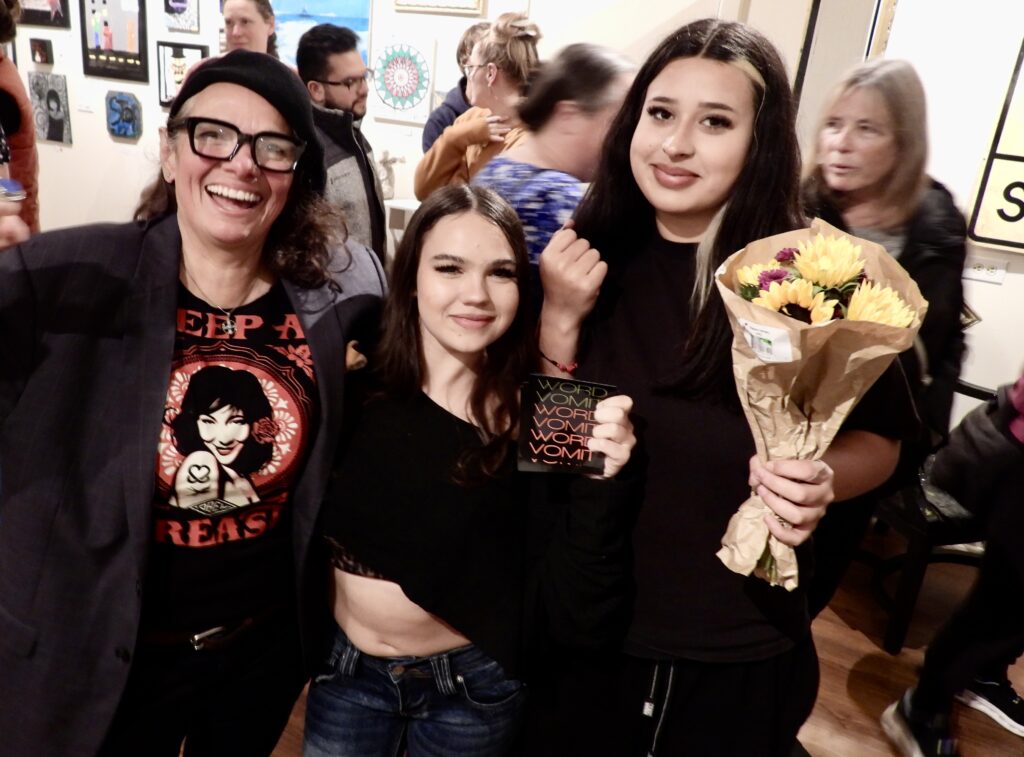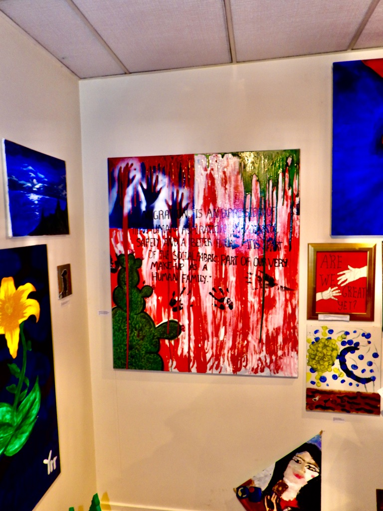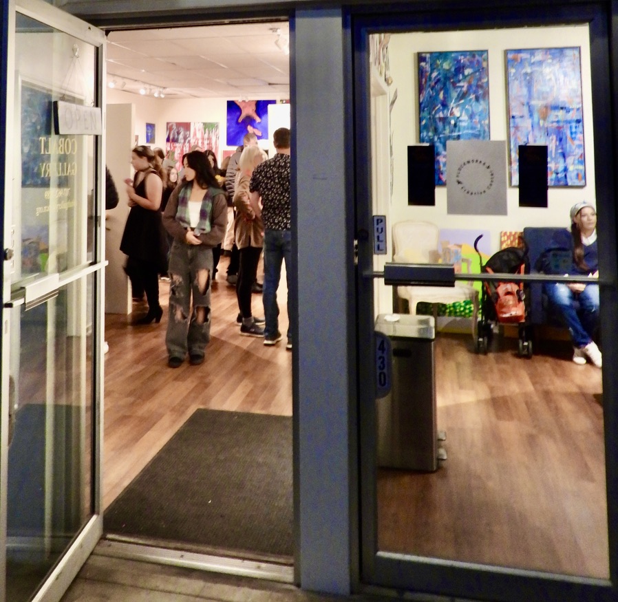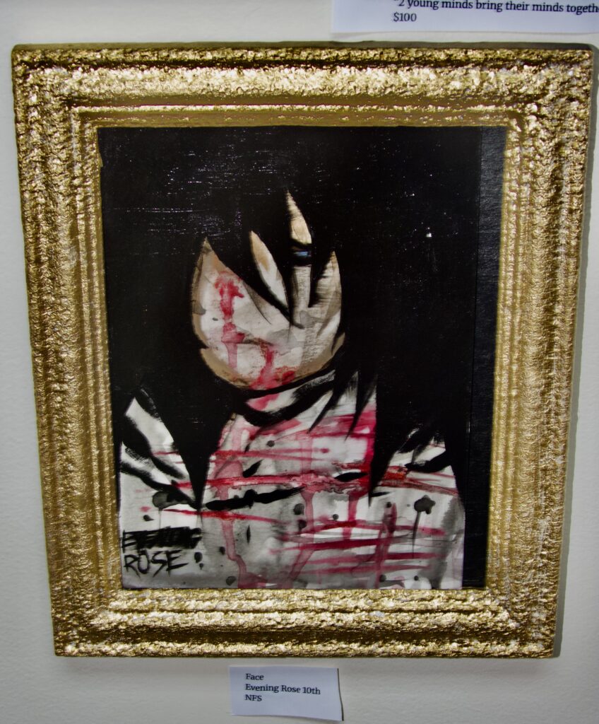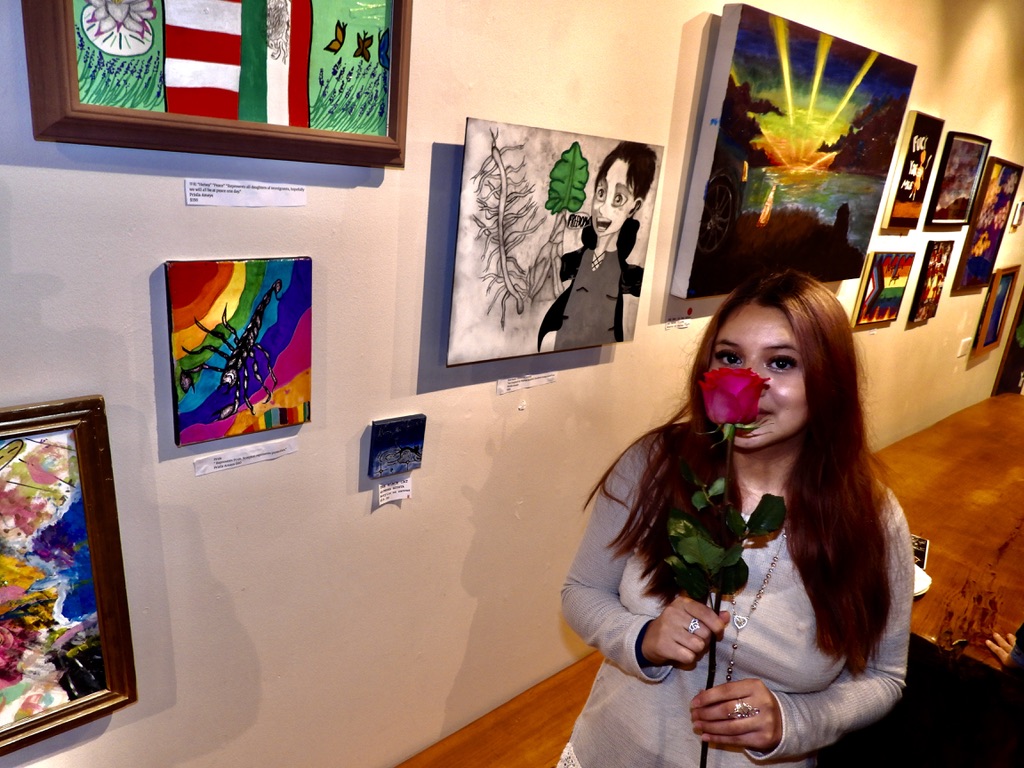 Roses in hand, young artists navigated a packed and buzzing First Friday opening, some electric with excitement, others pulled tight with nerves. The gallery’s energy snapped like a live wire — part celebration, part confession, part teenage storm about to break into color. Come out this weekend and see it!
