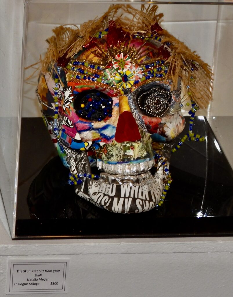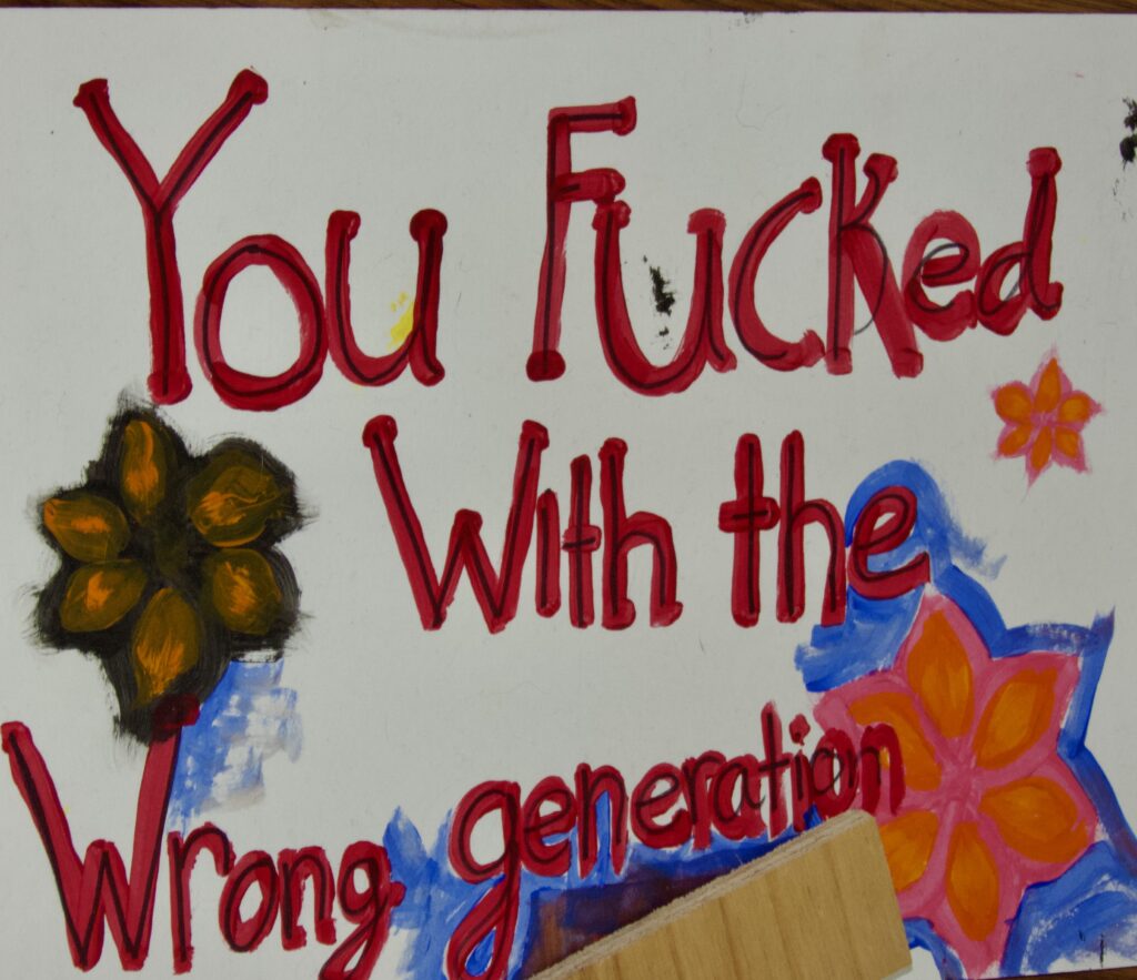 “You fucked with the wrong generation,” the students wrote more than once across the surface and signs of the giant collaborative skull. Before the show opened, art teacher Sally Rodriguez checked in with Noyo High Principal Gary Lewis to ask where the boundaries were on language.