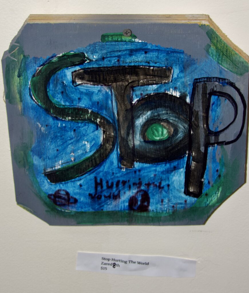 Zared’s contribution was a blazing blue‑and‑green octagon, “STOP” stamped in bold black across its center, with the gentler script “hurting the world” trailing beneath like a whispered aftershock.