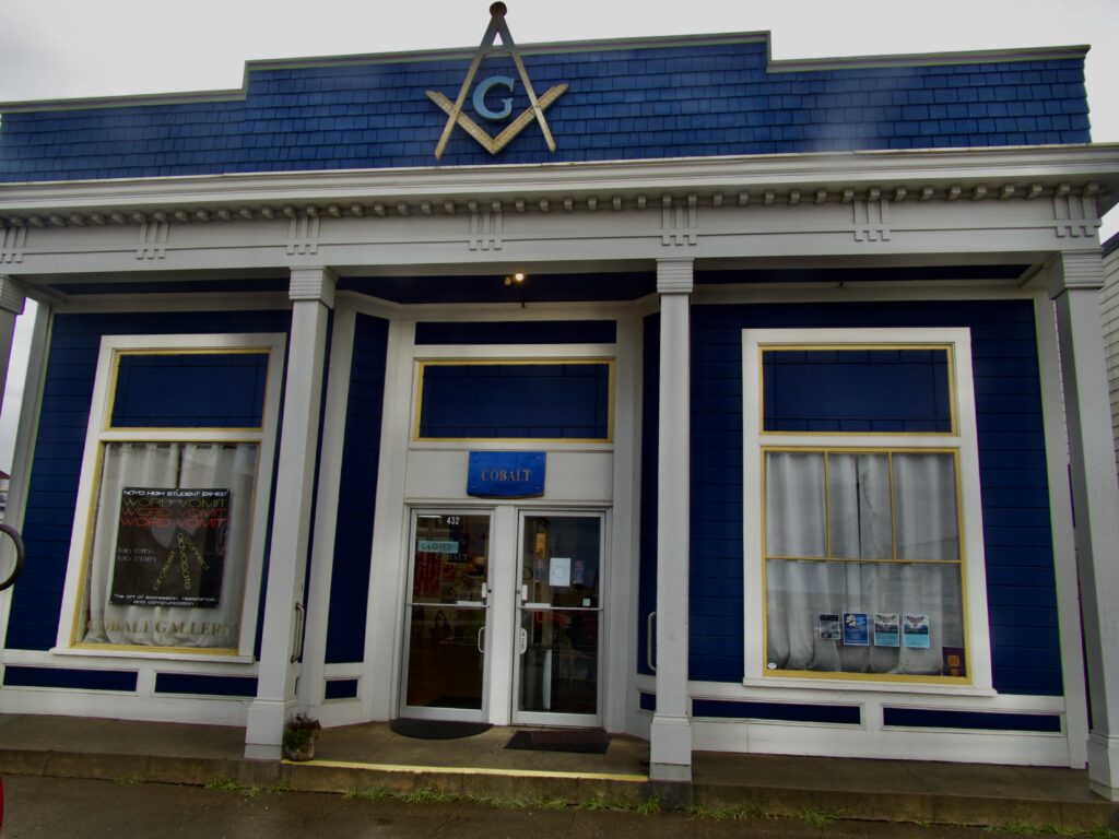 The Masonic Lodge Symbol and the all-blue coloring are just the start of the fun at the Cobalt Gallery. Cobalt was a contemporary art gallery until being acquired by the non-profit Flockworks. Before that, it was a printer repair business, skateboard shop, and Mandi Liberty’s beloved Paws for Cats and Dogs. We looked back and found this building one of the hardest working and most changeling of local buildings. In 1932 it was the home to the Fort Bragg Cemetery Company, After that Tucker’s Florist shop. In 1910 it was listed as Chapman Funeral Home and was adjacent to the hospital located just to the south on Main Street. We couldn’t figure out when the Masons used the building, especially when they started using it.. Their meeting hall was next door until the Lodge merged with the Mendocino Lodge in ???. County property records show the building owned by the “Fort Bragg Masonic Building” with an assessed value of $98,146 whcih simply means that is a prop 13 valuation. This only means that organization, presumably part of the Lodge, has owned the building for a very long time. The lot is 8070 square feet, smallish for Fort Bragg but would be large compared to commercial buildings in big cities. The property to the South, which used to be the hospital (prior to 1915) is owned by Silver Canul and is Mayan Fusion. The property to the north is a city parking lot.