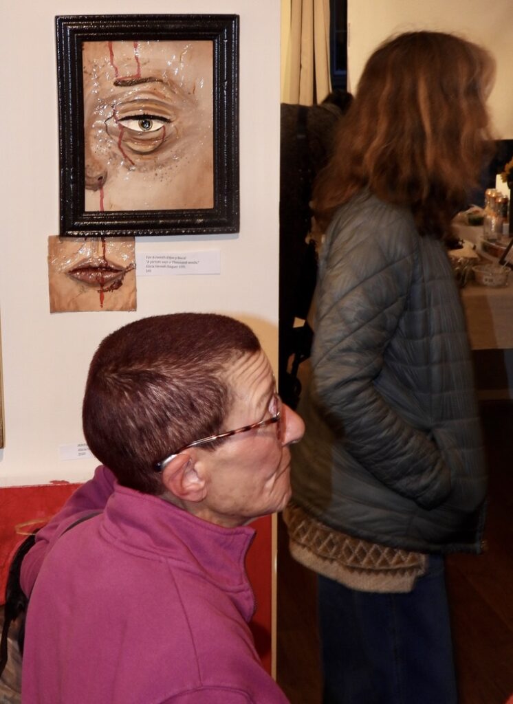 Renowned Mendocino artist Button Quinn ran the gallery before Flockworks took it over for educational projects, and she returned on behalf of the nonprofit for opening night. Like Linda and me, Quinn was amazed — downright agog — at what the Noyo High students had managed to create. She’s there to lend her experience and teach, but she’s also learning from the young artists, gaining fresh perspectives from the work they’re bold enough to make.