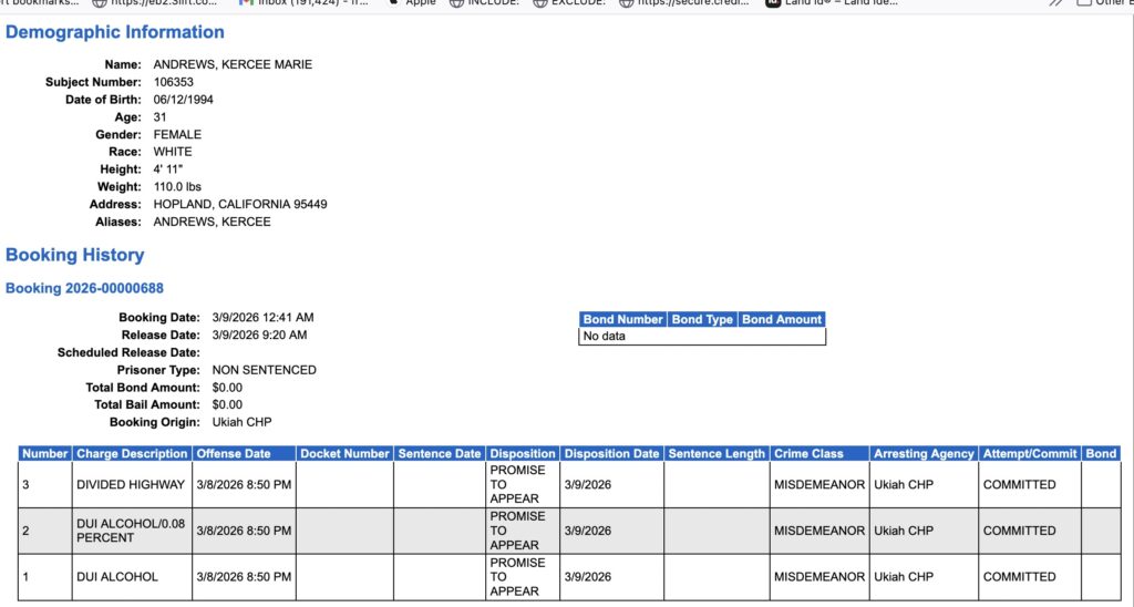 Again, there is no sign of a case filed beyond the booking log. Nothing in the courts. We’ve had long‑term concerns about inequitable prosecution in Mendocino County — and in every county we’ve worked in — but there is something particularly odd about DUI prosecutions here. We were researching this pattern when the courts cut off access. Now it’s hopeless.
