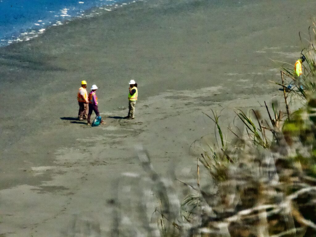 All around, invasive pampas grass continues its double role: polluting the ecosystem by crowding out endemic species, while still performing its original job of holding the hillside. To counter this, Caltrans is funding a native plant operation—species that can stabilize slopes, feed birds, and coexist with the underground web of mushrooms and microbes, building a sustainable ecosystem. The restoration is required mitigation for the destruction of Blues Beach’s north end.