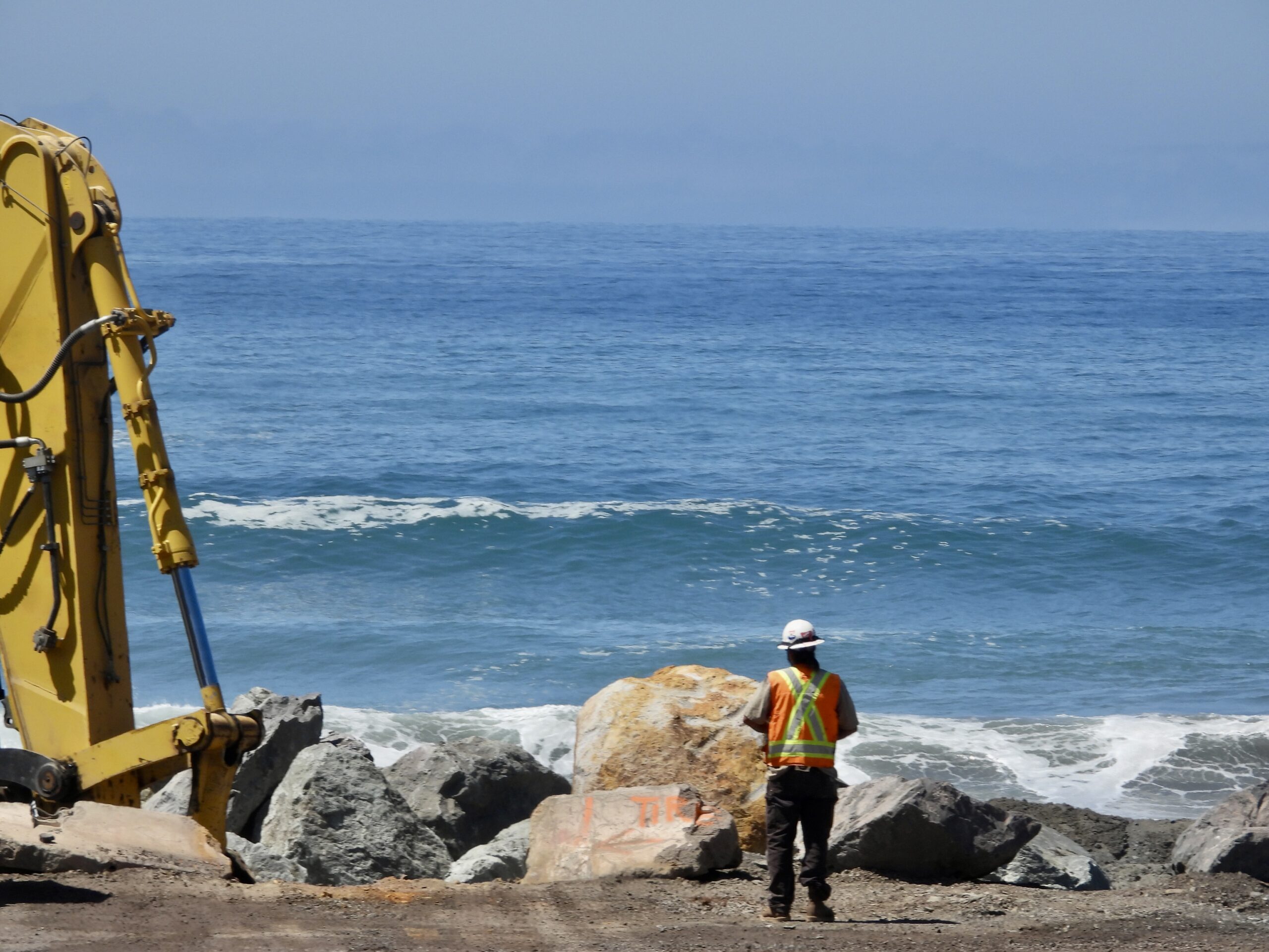 1. Transporting over 13,000 massive boulders, totaling at least 180 million pounds. Caltrans is purchasing the largest rocks available anywhere in the state, while Myers and its subcontractors have been scrambling to secure enough trucks and drivers to maintain a steady flow of boulders from multiple directions. It’s no exaggeration to say that boulder-hauling trucks now rival the number of logging trucks on Mendocino Coast roads.