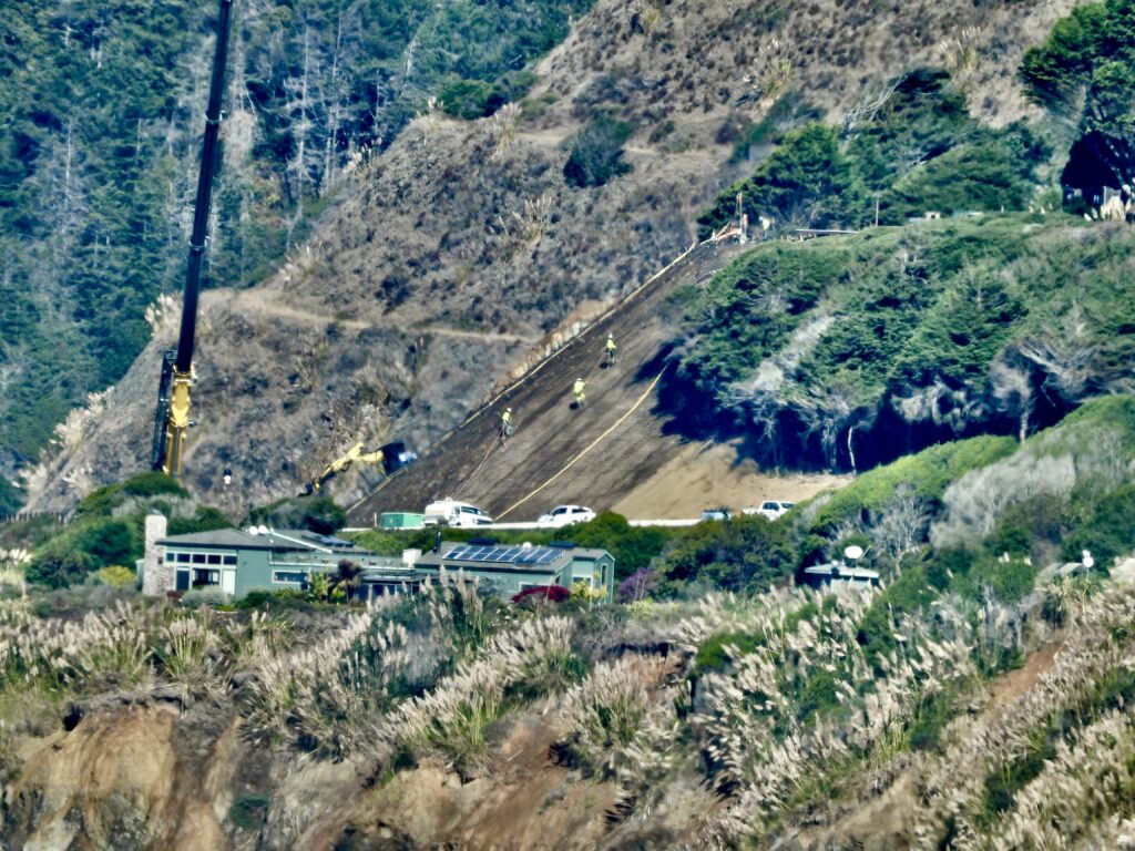 Continuing north, Juan Creek hosts another colossal project. A 150‑foot crane, fully extended, was used to drape huge steel nets across an entire hillside. The nets were installed by specialized crews—half construction experts, half acrobats, likened to the Flying Wallendas as they worked suspended on cables, performing a repair-circus as watchable as one under the Big Top.. Highway 1 is in peril here too. But unlike Blues Beach, where there is no room to shift east, engineers have been slicing the hill back regularly—like a butcher carving slices from a mountain‑sized ham. That strategy has meant taking more property to the east by eminent domain. This time, Caltrans increased compensation after property owners argued they had been underpaid, even as they accepted the highway creeping ever closer to their large and valuable homes.
