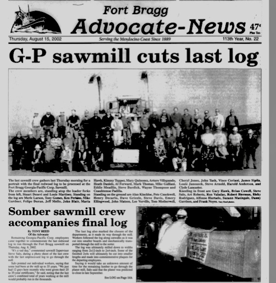 This national story really doesn’t tell what is happening here. Fort Bragg is still recovering from the biggest trauma of its existence, the closure of its anchoring lumber mill by Georgia Pacific in 2002. Generations of locals had good jobs there and in the Louisiana Pacific mill down the road. Suddenly, they were all gone. Mendocino County loggers whacked trees at a staggering and unsustainable rate for the century prior to 2002. With the big redwoods mostly gone by the 1970s, there was no longer a reason to have a mill here. Shortly thereafter, the California Western Railroad went bankrupt and the Hart family and Sierra Railroad were treated as saviors. The town wrangled what to do with the abandoned and polluted millsite for almost 20 years before the Skunk got the property through purchases and a friendly eminent domain proceeding with Georgia Pacific, with GP/Koch Brothers long eager to get out of town.