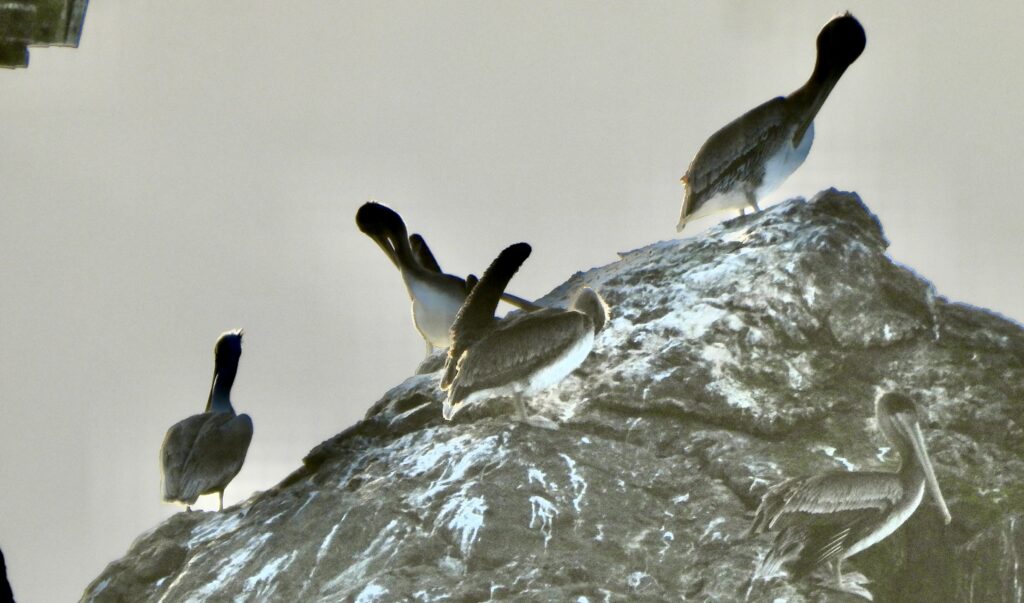 These pelicans have procrastinated their trip south. The fog surrounds the birds, seemingly unseen