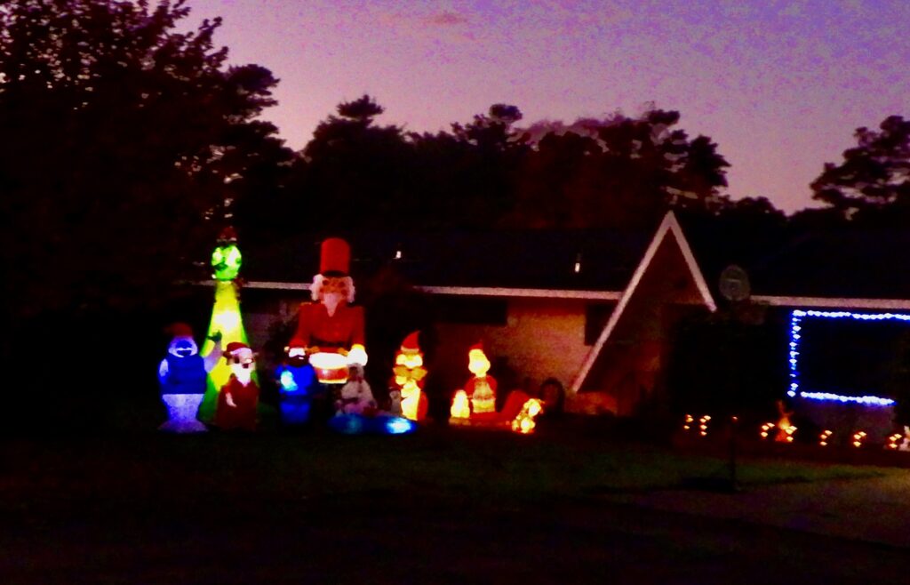We did get to enjoy a beautiful display of Christmas at the patriotic house just south of Green Acres, and this from our neighbors, whose son Dean likes to watch from inside as passerbys enjoy the inflatable Christmas cheer!