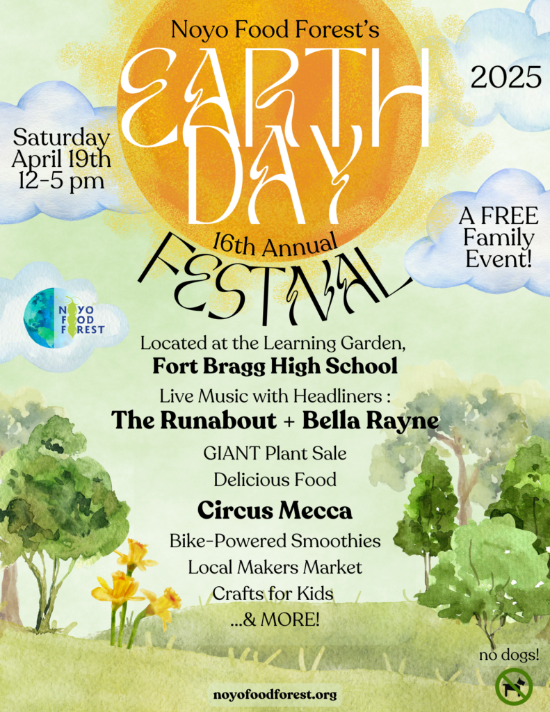 “Sign-holding rally this Saturday, April 19th, in conjunction with 50501. Starts at 11:00 a.m. so that it won’t interfere with the Noyo Food Forest Earth Day event. We’ll end at noon and encourage people to head to the Earth Day Festival then,” said Christie Olson-Day of Indivisible Mendocino. (50501 stands for 50 protests 50 states and 1 message)